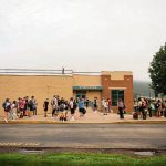 Parents wait to drop their children off for the first day of school at Highlands Elementary School in Tarentum on Thursday, Aug. 26, 2021.