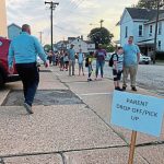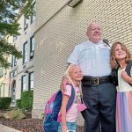 Vandergrift Police Chief Joe Caporali greets Kiski Area East Primary students Kylie Ryan and Averie Carney Thursday on the first day of school.