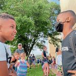 Friends and third-graders Enzo Hutcherson and Jeremiah Evans chat Thursday on the first day of school at Kiski Area East Primary in Vandergrift.