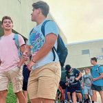 Leechburg Area High School seniors and friends Thomas Burke and Tino DeCapite on campus Wednesday on the first day of classes.