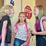 David Leech Elementary School students Saydee Suppers, Karlee Hill and Chloe Reed catch up Wednesday morning before heading into class on the first day of school.