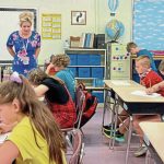 Fifth-grade teacher Jennifer Turner settles her students in on the first day of classes Wednesday at David Leech Elementary School in Leechburg.