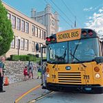 Security guard Lee McIntire stands by as students get off the first bus to arrive for the start of the 2021-22 school year at Highlands Elementary School in Tarentum on Thursday, Aug. 26, 2021.